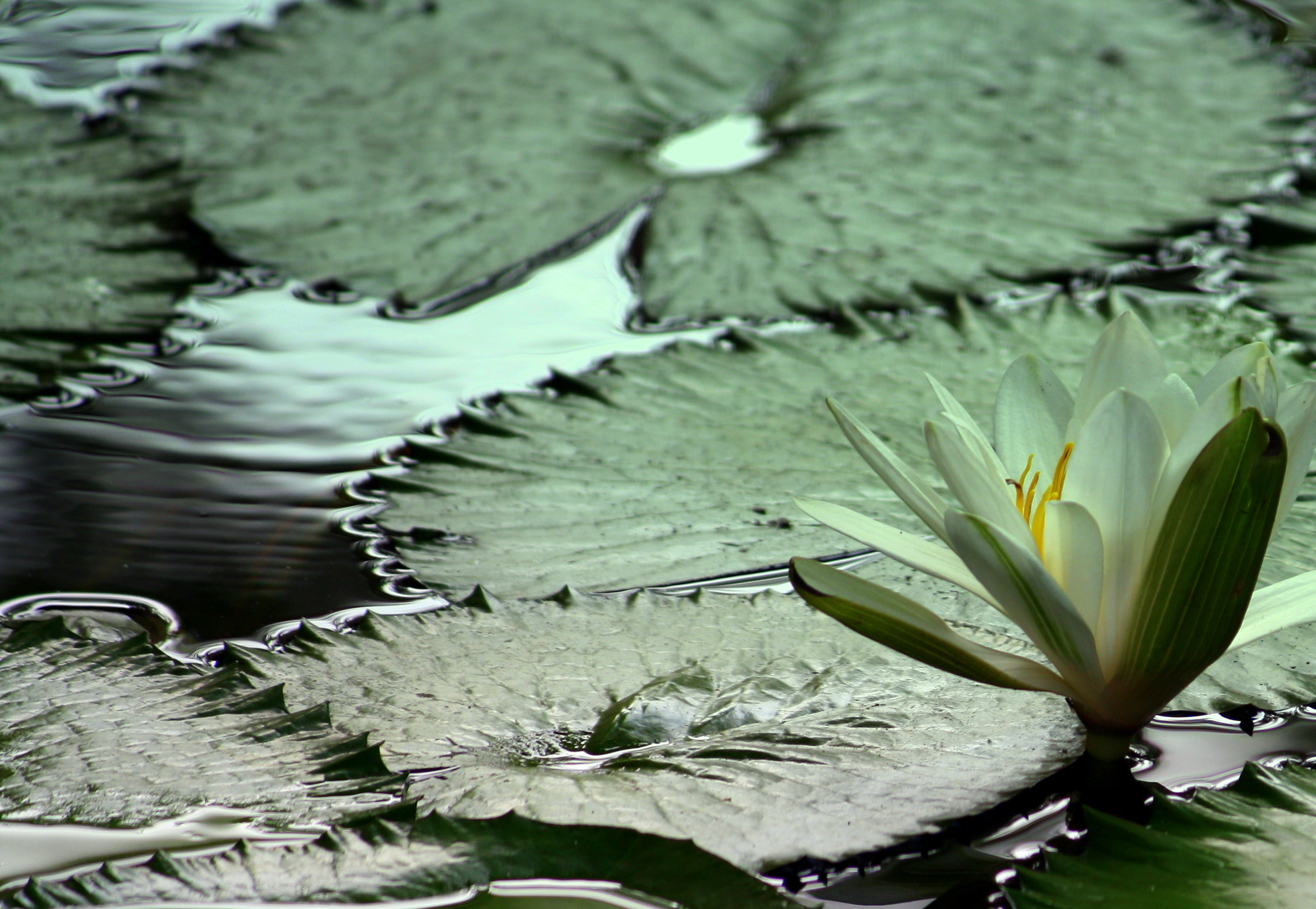 First, the flatness of the floating leaves and the water, which becomes more abstract the further one goes into the background of the shot. And the brightness of the water too in the rear of the shot – these factors conspire to make the image look increasingly abstract as one goes further back into it.