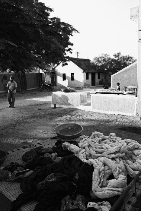 That is Goat wool. Natural and Black. Dried in the sun before weaving :). Weaver’s house is so interesting. I go there frequently and enjoy my brush with rural India. Reply