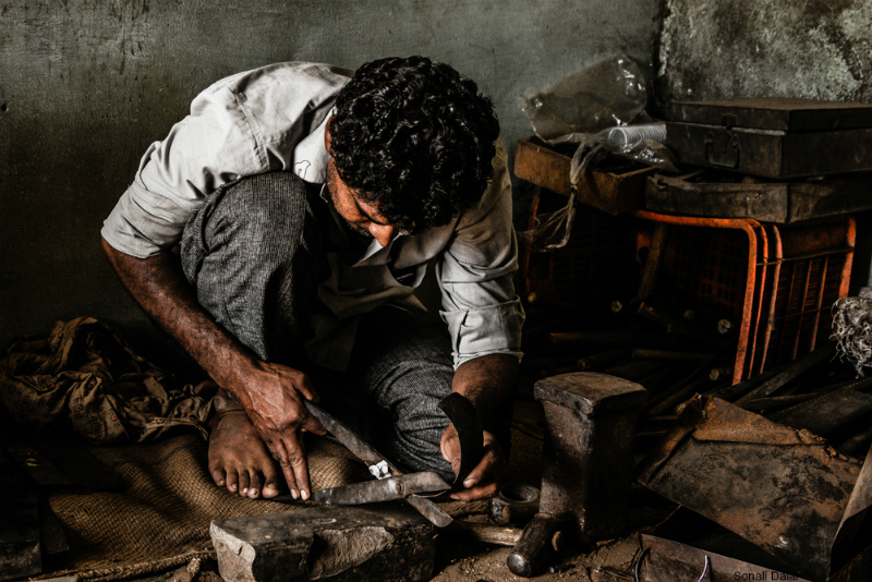 Beautiful details and colours, a wonderful portrait of someone at their work, someone in their world – and I especially like how he is holding it steady with his foot – another really excellent photograph, my friend! A 🙂