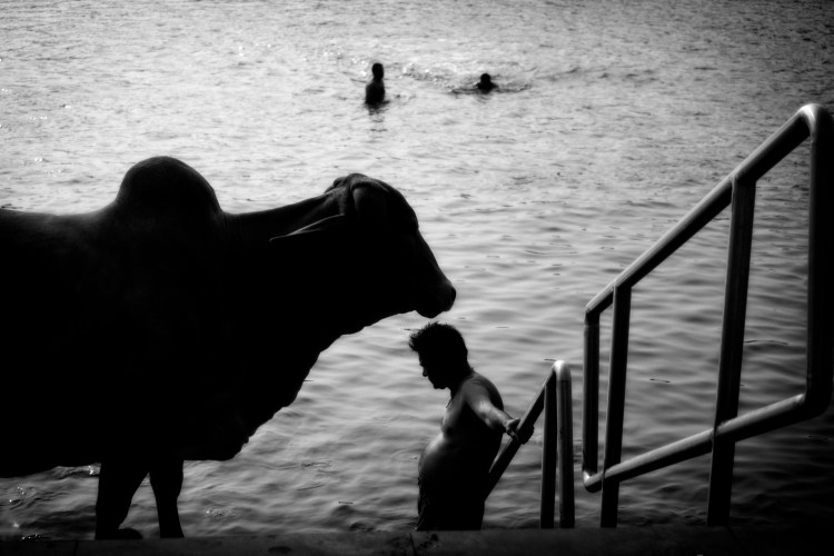 1. Yes, I agree, a moment beautifully captured; perfect in b+w; and with wonderful composition too – the railings take me down to the man, and then there’s the huge bulk of the cow, looming over him, framing him; the swimmers prevent a bare background. Good stuff! A 🙂